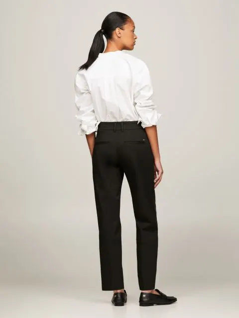Byxorna har en slim fit-siluett med raka ben, normal midja och klassisk stängning med knapp och dragkedja. Den svarta färgen gör dem till ett nyckelplagg i garderoben – lika snygga med skjorta och loafers som med sneakers och t-shirt. Diskreta Tommy Hilfiger-detaljer som logotypflaggan vid fickan ger en exklusiv finish.
