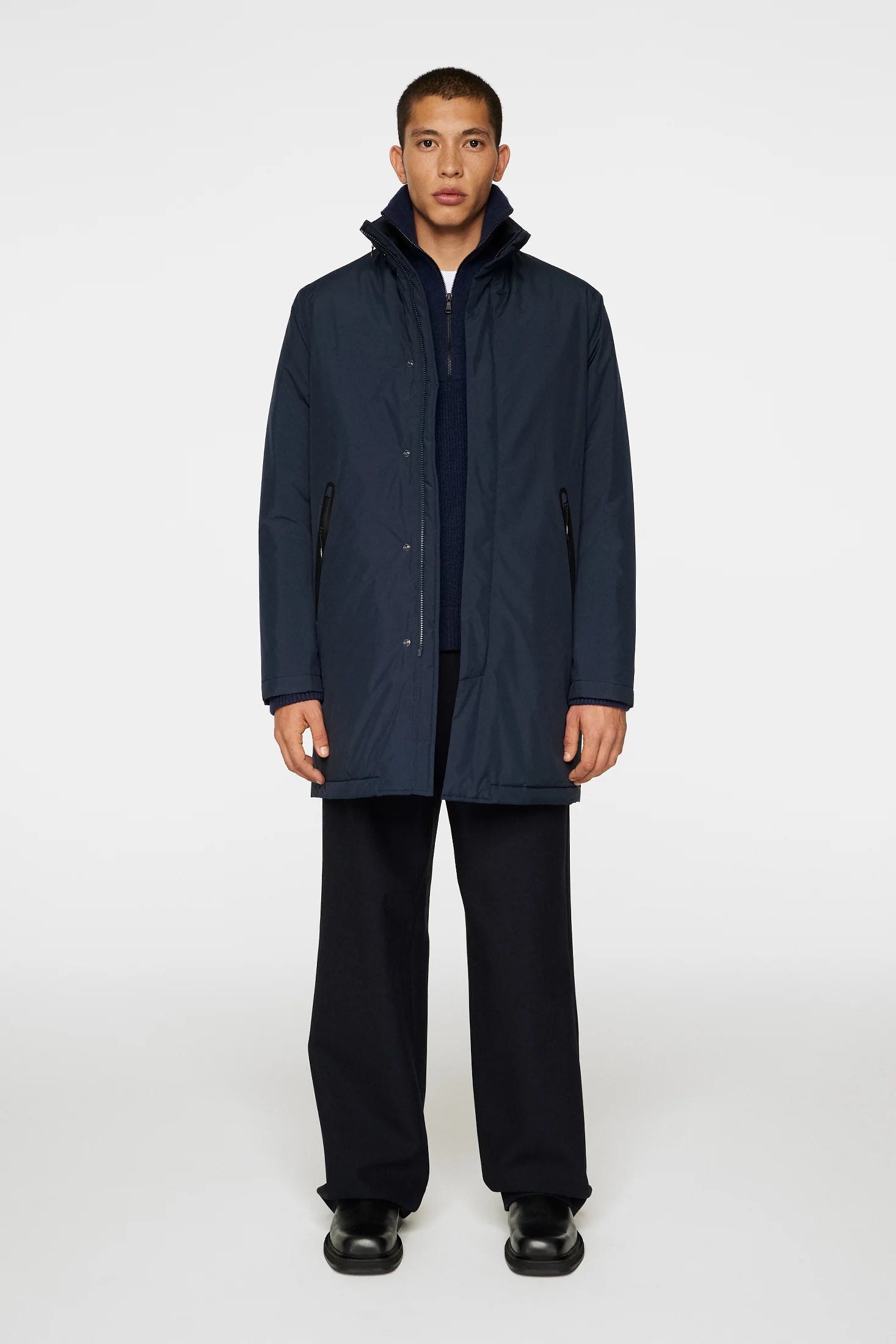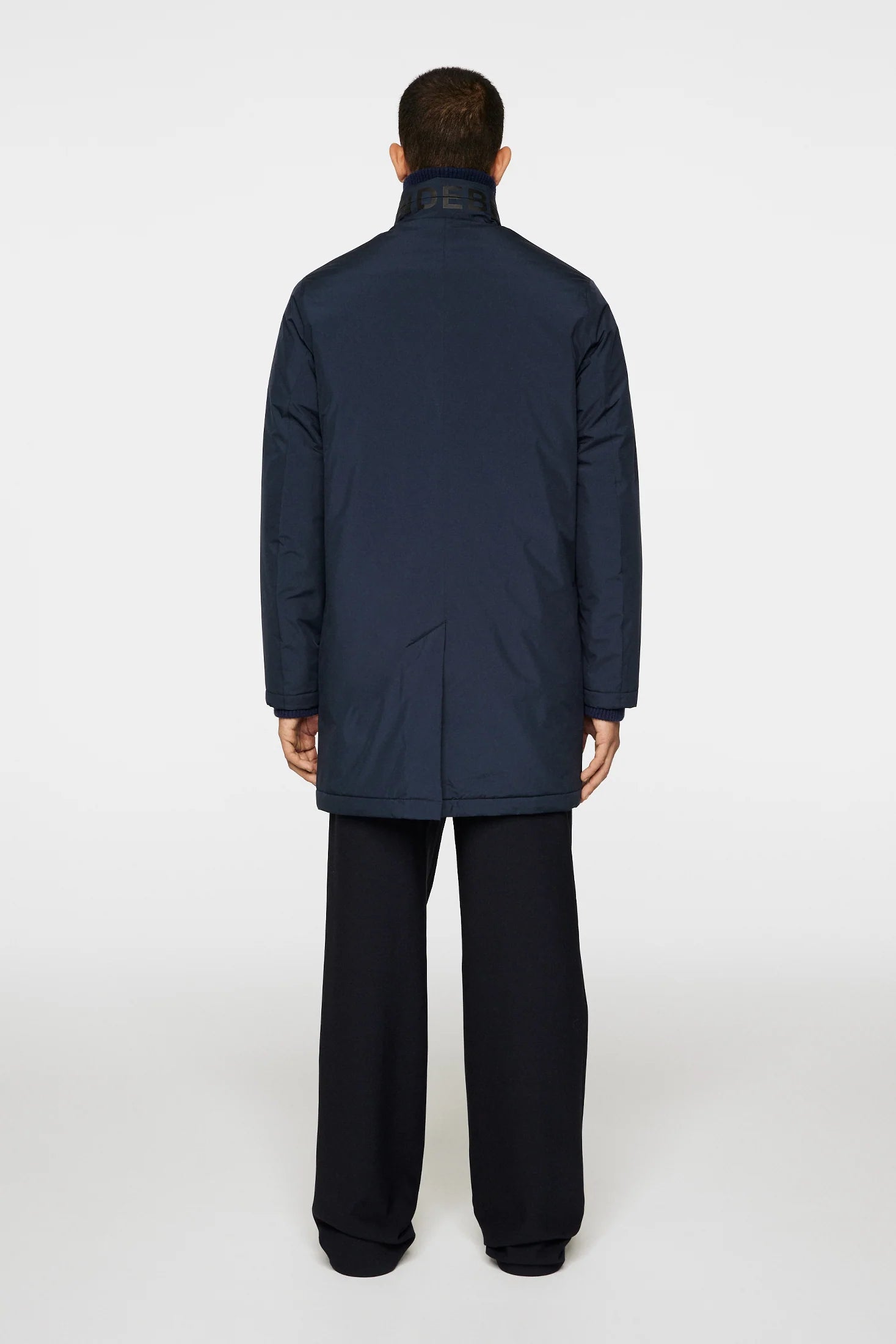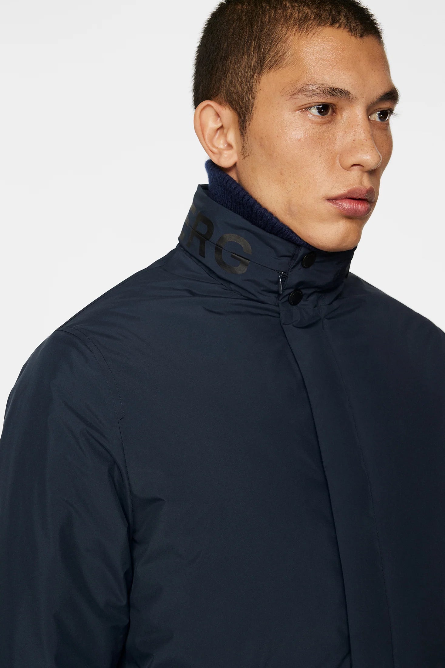 Rocken har regular fit-passform och ett rent, skräddat snitt med dold knappslå, hög krage och subtila JL-detaljer. Den mörkblå färgen JL Navy ger ett sofistikerat uttryck som fungerar lika bra över kostymen till kontoret som över en stickad tröja under helgen.