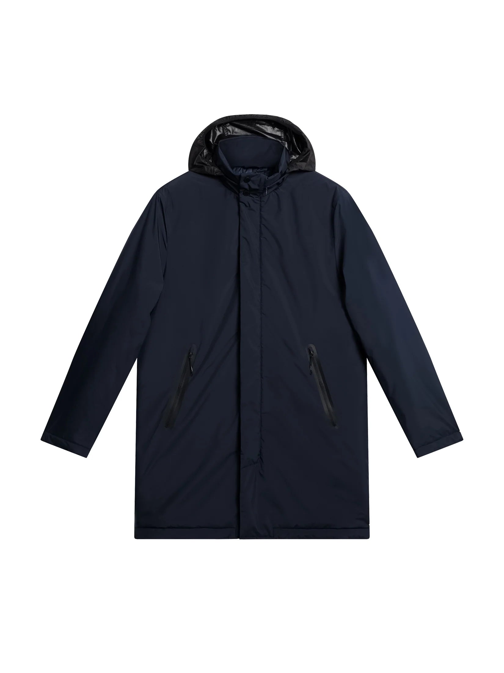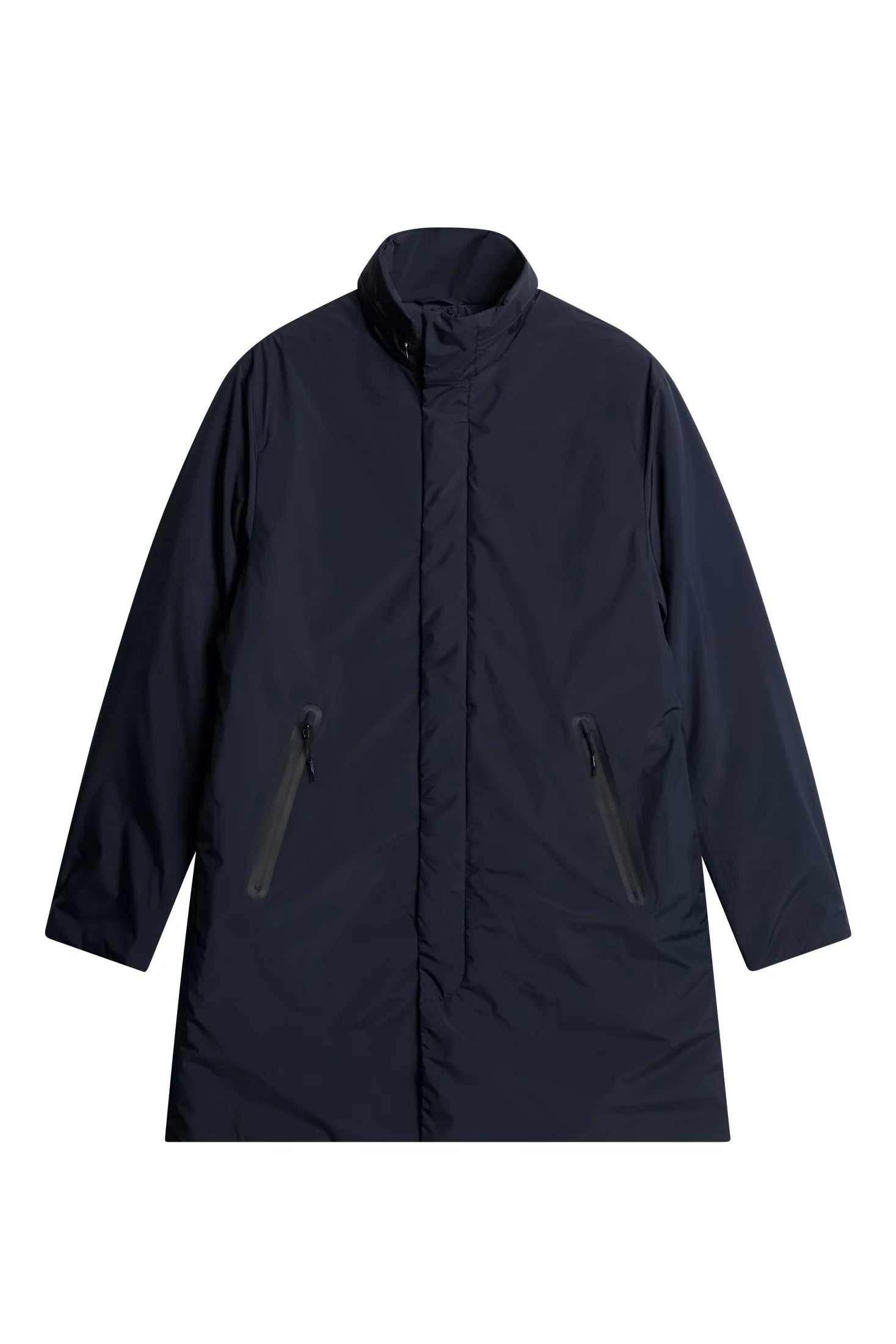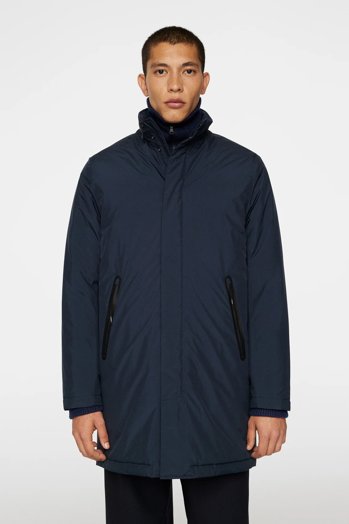 Rocken har regular fit-passform och ett rent, skräddat snitt med dold knappslå, hög krage och subtila JL-detaljer. Den mörkblå färgen JL Navy ger ett sofistikerat uttryck som fungerar lika bra över kostymen till kontoret som över en stickad tröja under helgen.