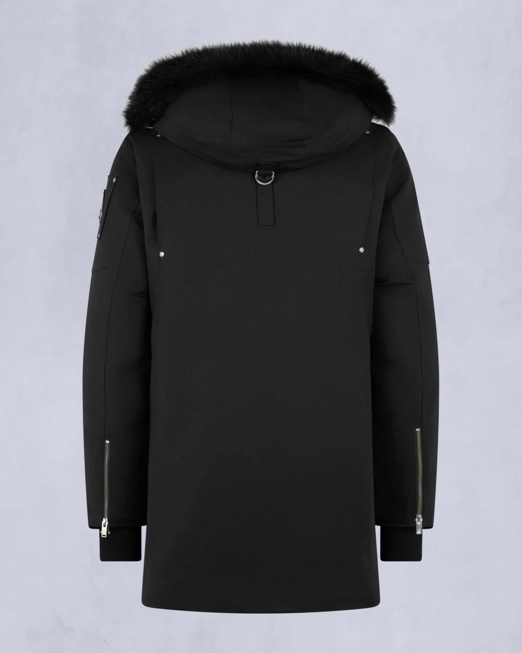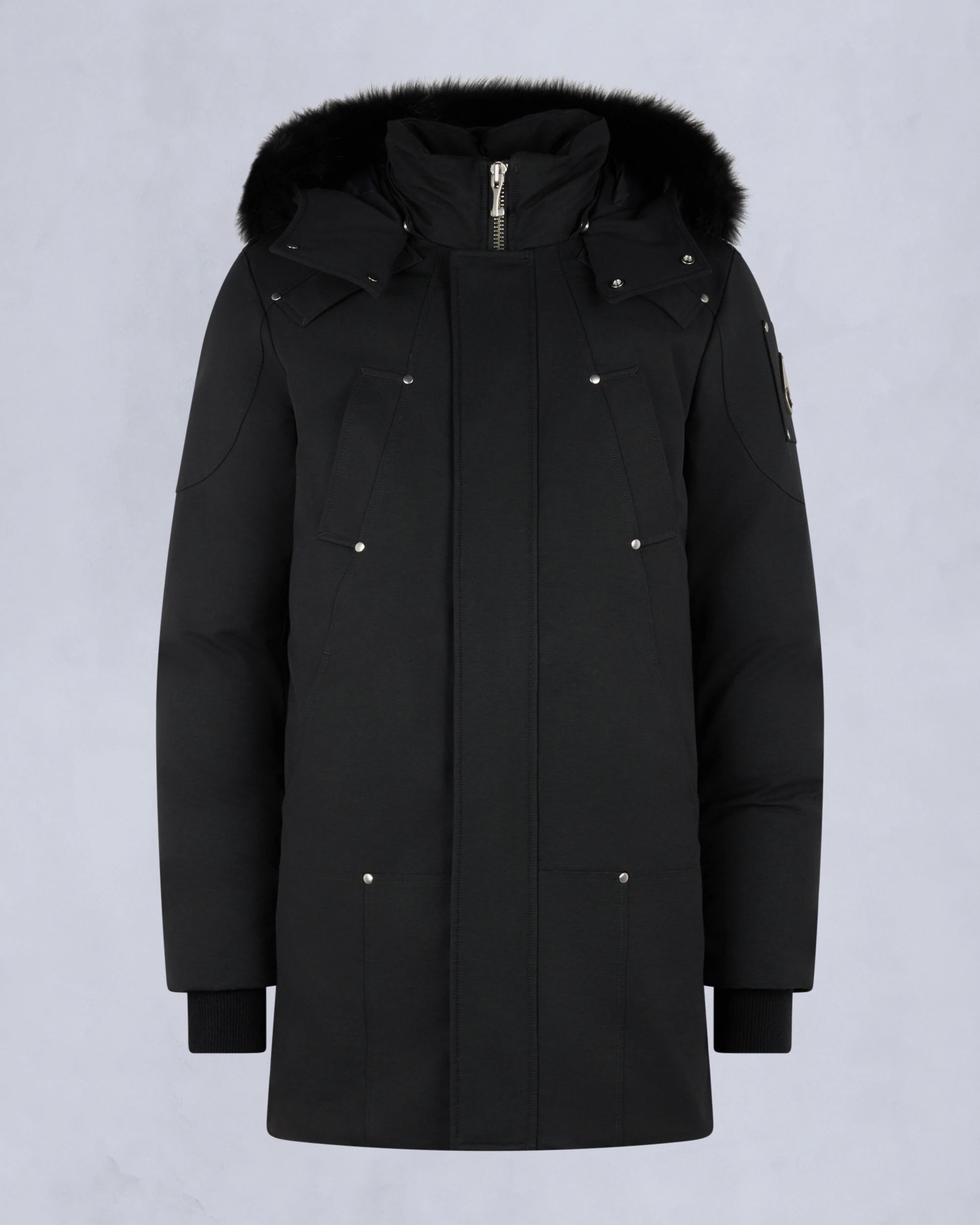 Parkasen har en klassisk längre siluett med avtagbar huva fodrad med äkta Neoshear-shearling, en signaturdetalj som ger både värme och exklusiv karaktär. De robusta metallknapparna, glansiga dragkedjor, förstärkta sömmar och den metalliska Moose Knuckles-logotypen på ärmen understryker varumärkets exklusiva hantverk.