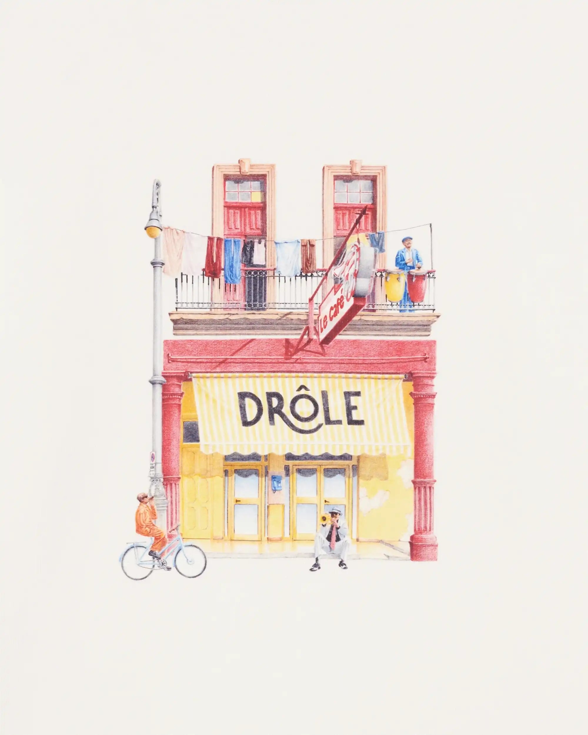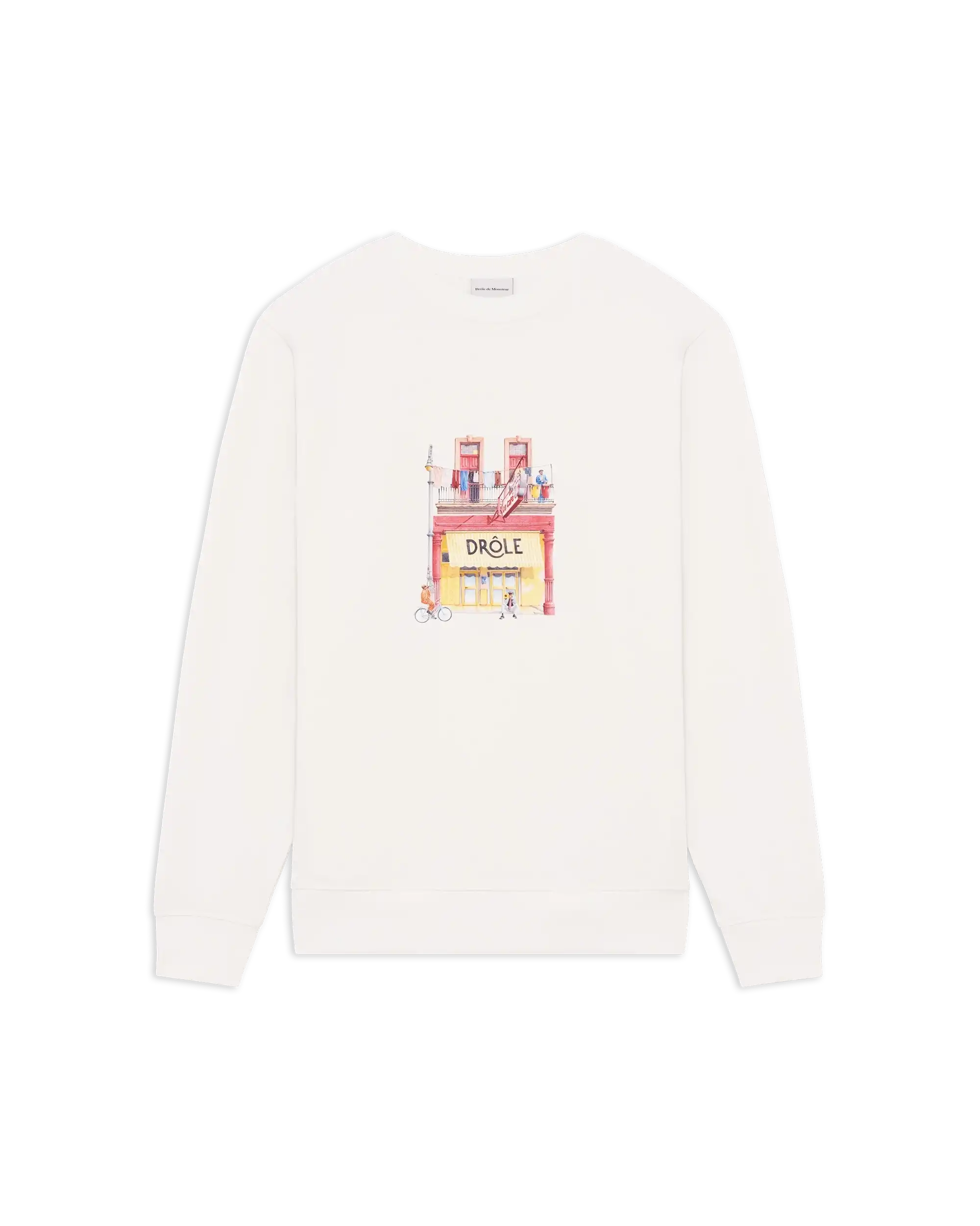 Tröjan är tillverkad i mjuk bomull och pryds av en mindre Drôle Café-brodyr på bröstet samt en större broderad grafik på ryggen som skapar en tydlig signatur för varumärket. Ribbade muddar vid krage, ärmslut och nederkant ger en klassisk konstruktion och en bekväm passform.