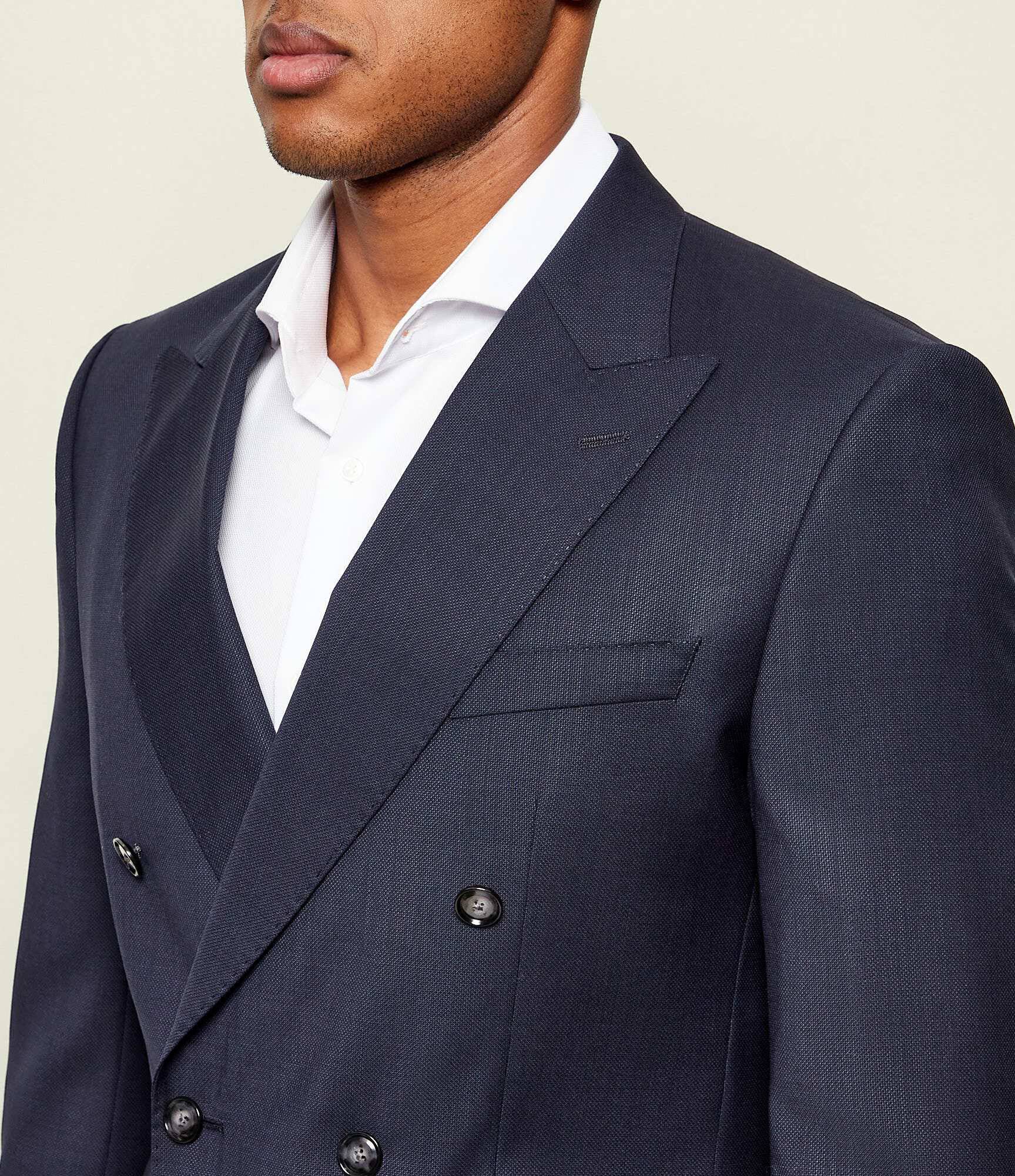 Den djupa marinblå tonen ger ett tidlöst och kraftfullt uttryck, medan den dubbelknäppta fronten skapar en distinkt och självsäker look. Slim fit-passformen formar kroppen på ett elegant sätt utan att kompromissa med komfort.