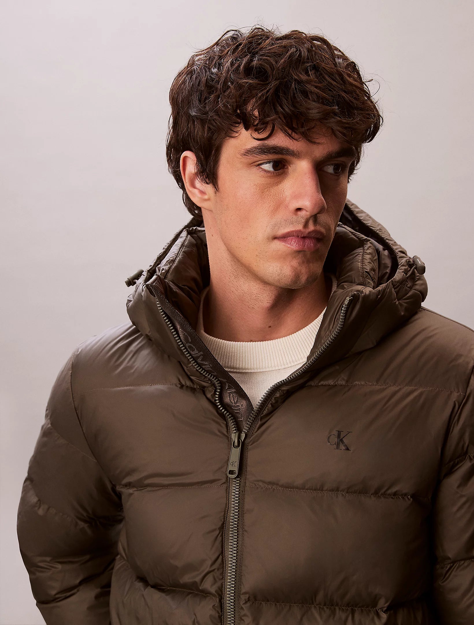 Jackan har en avtagbar huva med dragkedja, vilket gör den flexibel från dag till kväll. Den raka passformen och den höga kragen ger ett stilrent uttryck, medan den svarta Calvin Klein-logotypen på bröstet adderar en subtil premiumtouch.