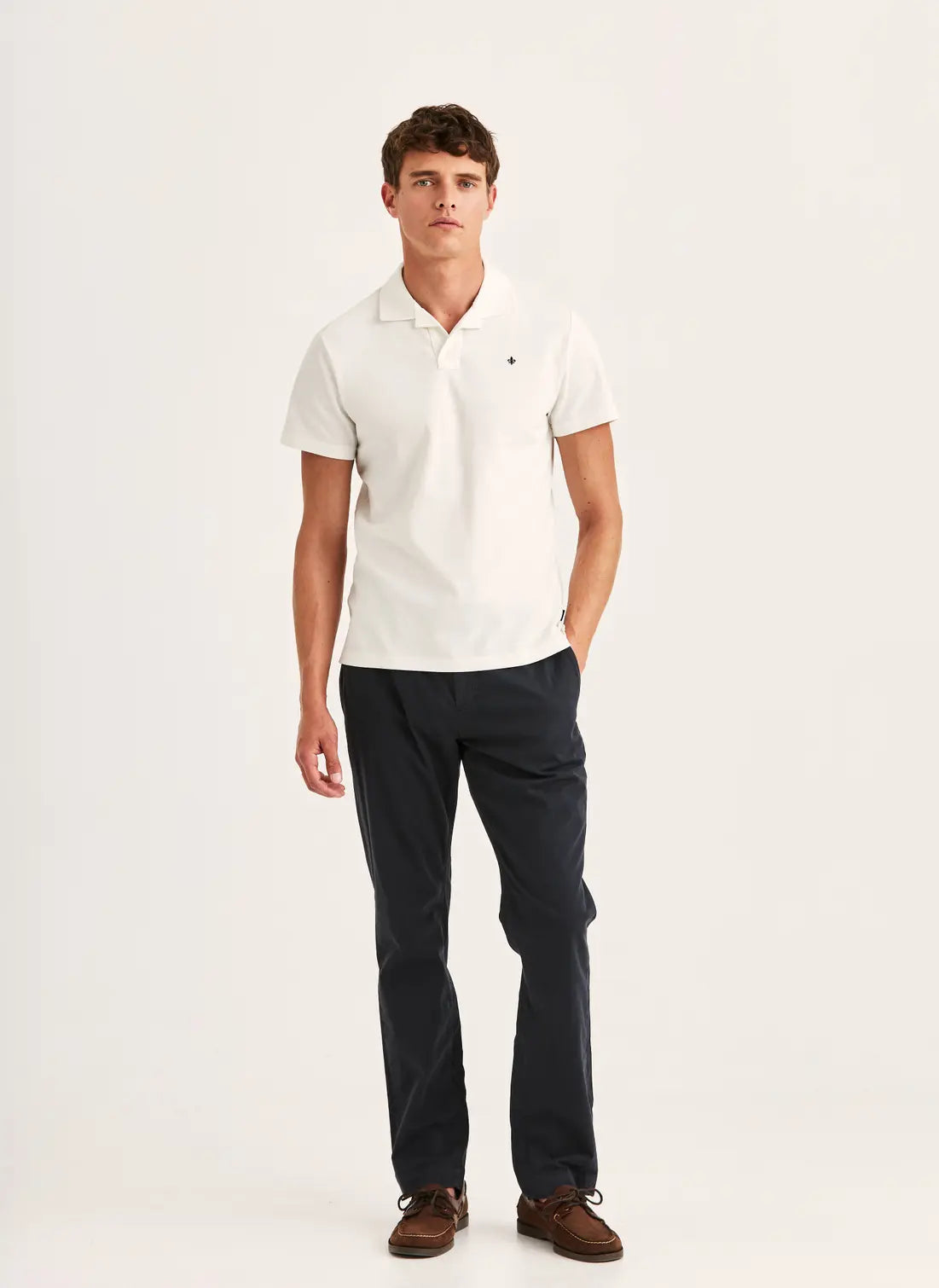 Morris Stockholm Dylan Piqué Shirt är varumärkets klassiska kortärmade piké i 100% bomull med en mjuk pikéväv som ger tyget en lätt strukturerad yta och naturlig andningsförmåga. Pikéväven, med sina regelbundna upphöjda rutor i tyget, är en av de mest funktionella bomullskonstruktionerna för varmare dagar eftersom den ökar luftflödet mot huden jämfört med ett vanligt enkeltrikå. Den smala passformen är skräddad för ett rent och definierat intryck som håller sig lika välvårdat under en kavaj som ensamt till chinos eller shorts, vilket gör Dylan Piqué Shirt till ett av kollektionens mest mångsidiga plagg. Den broderade Morris-liljan på bröstet är varumärkets diskreta signaturdetalj. Plagglängden i storlek M är 70 cm, bröstvidd 52 cm och axelbredd 45 cm med en ärmlängd om 43,5 cm. Tillgänglig i storlekarna S till XL och i ett brett utbud av färger inklusive off white, khaki, orange, blå, old blue, grön, olive och brun. Maskintvätt 40 grader, ej blekning, ingen torktumling, strykes ej.