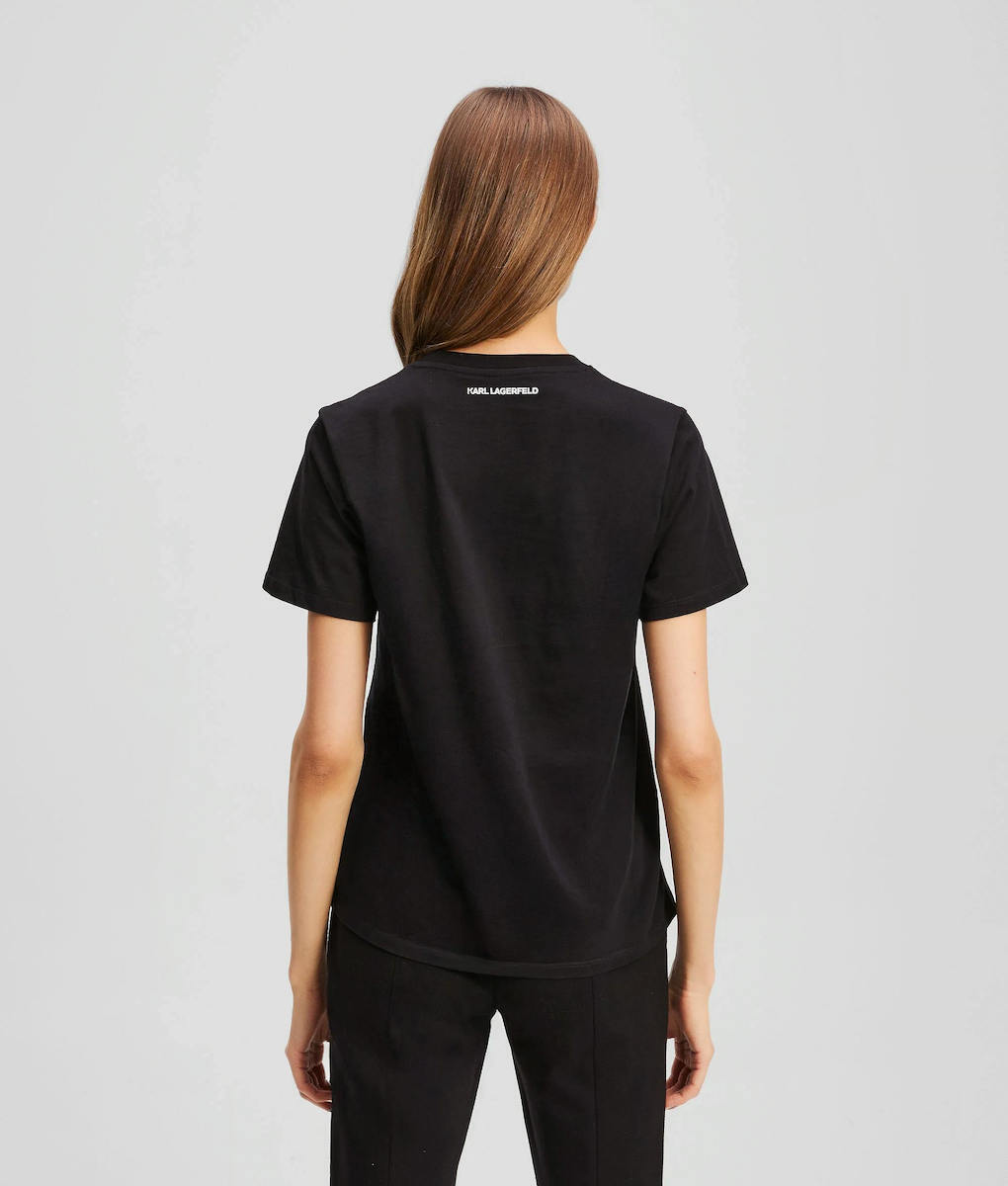 Karl Lagerfeld T-shirt (A3W17105) är en ikonisk och stilren dam-t-shirt i 100% mjuk bomull, designad med märkets karakteristiska minimalistiska elegans. Den har en regular fit-passform med klassisk rund hals och kort ärm, vilket gör den både bekväm och tidlös.