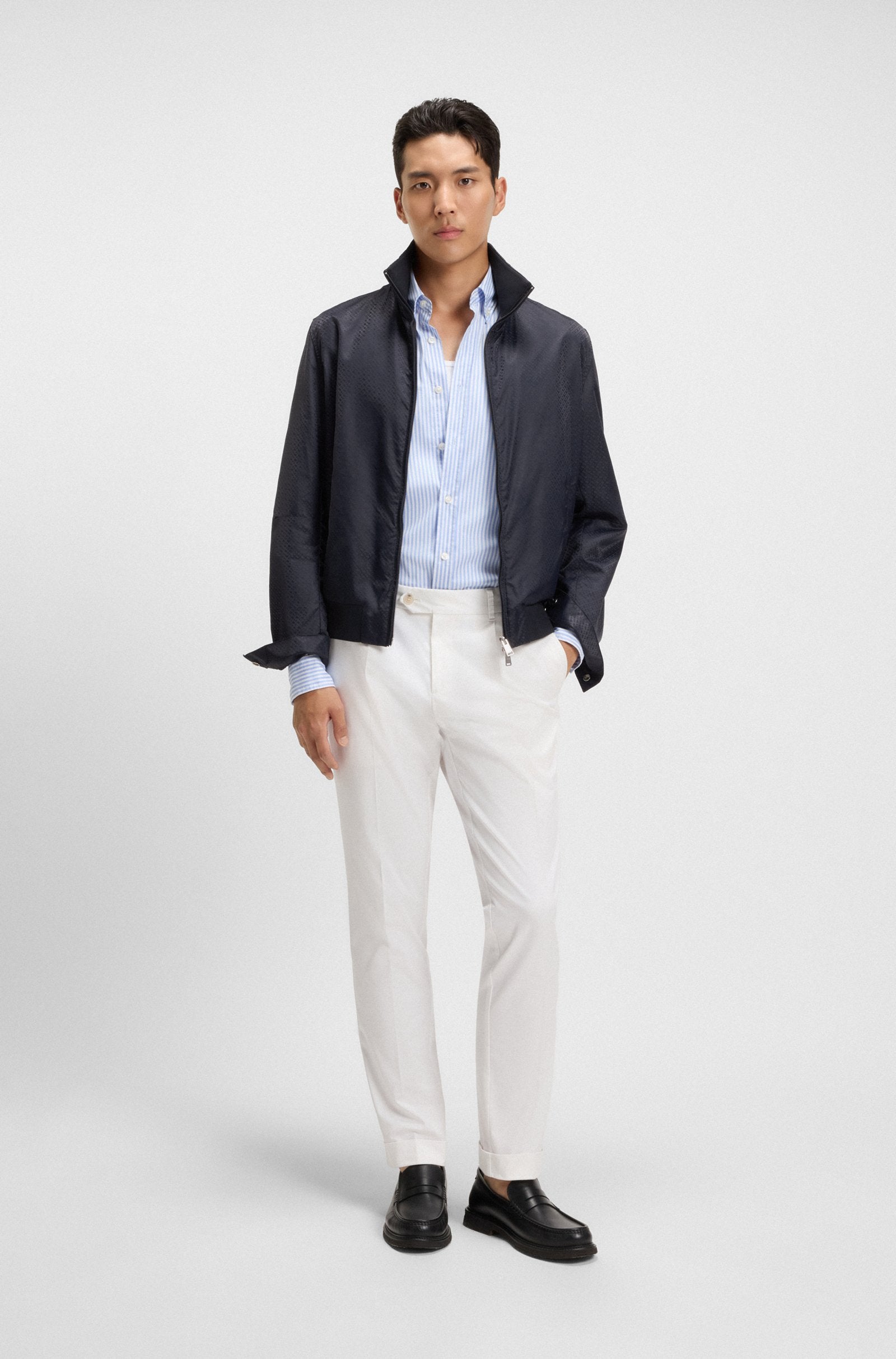 Boss Water-Repellent Jacket with Monogram Jacquard  är en exklusiv herrjacka som kombinerar teknisk funktionalitet med modern design. Tillverkad i ett vattenavvisande tyg, skyddar den mot lätt regn och vind, samtidigt som den behåller en sofistikerad look.